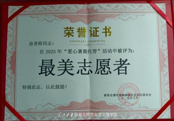 我是完美网页版人文学部中文2407班涂景皓,暑假回来后,报名参加“情注艾都”志愿服务队,进驻漕河镇枫树林社区,开启为期30天的“七彩假期”托管班项目。