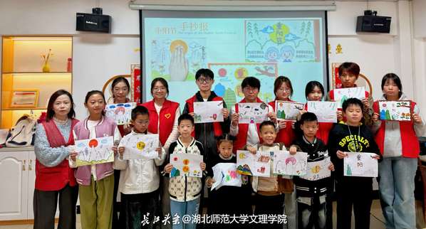 在主题宣讲环节,汉语言文学2402班的石灵玉同学借助生动有趣的图文,为孩子们讲解了重阳节登高、佩茱萸、赏菊等传统习俗,并阐释了其中蕴含的“敬老慈幼”文化内涵。“重阳不仅是一个节日,更是一份亲情的唤醒、一次陪伴的提醒”,她结合现实生活,引导孩子们理解关爱长辈、珍惜团聚的重要意义。