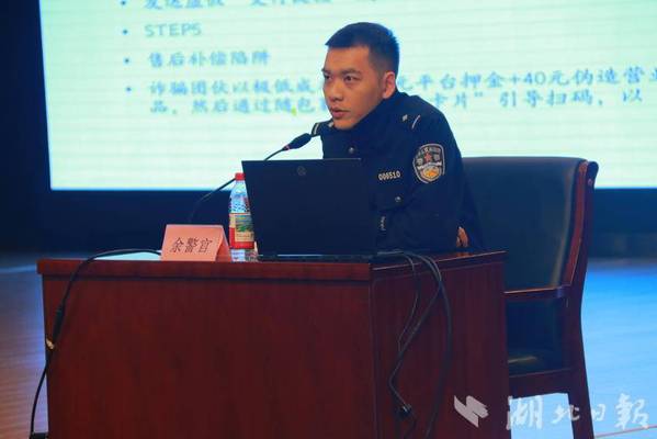 歌声余韵未了,反诈知识专题讲座开讲了,汪仁派出所社区民警余耀櫆走上讲台,结合近期高校及周边发生的真实案例,精心制作了课件,深入剖析了网贷、刷单等针对学生群体高发的诈骗类型,提醒同学们要牢记“三不一多”“十个凡是”等反诈秘籍,时刻保持警惕,守好“钱袋子”。民警的授课内容实用、警示性强,引起了在场学生的深刻共鸣。