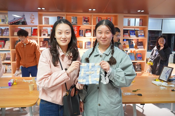 在等待染品浸泡晾晒的间隙,活动特设“非遗+”互动环节。学生党支部成员化身“非遗小导师”,手把手教授传统盘扣技艺,从基础绕线到花样成型,耐心拆解每一个步骤。来自广西白裤瑶族的黎闰青同学,还分享了民族特色“自由缝”缝纫技能,以随性创作的理念引导大家放松身心,在针线穿梭中感受非遗的治愈力量。