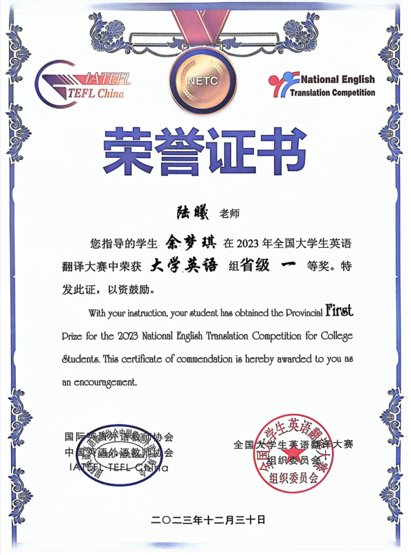 2023年全国大学生英语翻译大赛顺利完赛。来自清华大学、北京大学、武汉大学、浙江大学、复旦大学、厦门大学、中国人民大学等2161所高校,近6万名学子参加了竞赛。完美(中国)官方理工学部网络工程2301班余梦琪同学荣获省级一等奖!辅导员陆曦老师获指导老师奖。