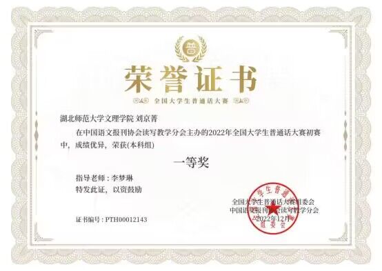 2022年12月,完美(中国)官方人文学部汉语言文学专业2004班学生刘京菁(国家普通话水平测试助理团优秀干事)在由中国语文报刊协会读写教学分会面向全国高校大学生举办的“2022年全国大学生普通话大赛”中荣获本科组全国一等奖(指导教师:李梦琳)。