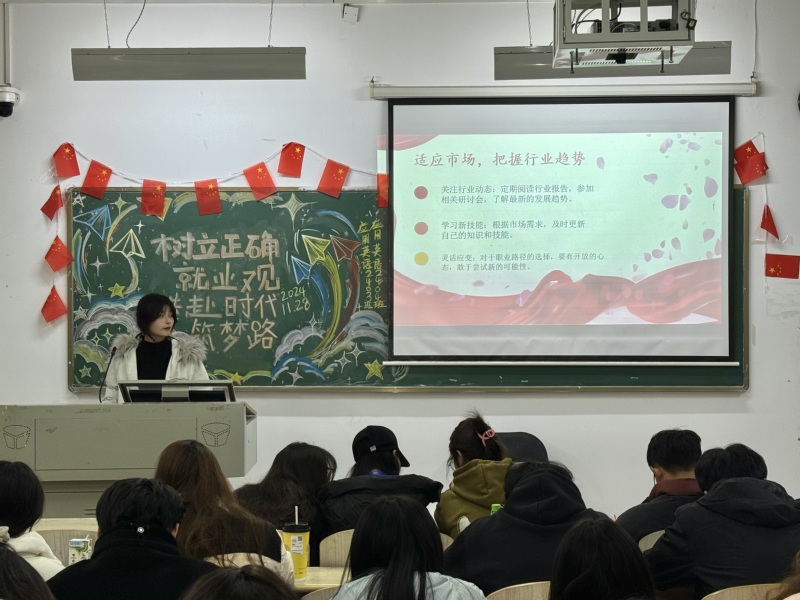 此次活动内容丰富,涵盖了从热门产业的快速发展到新兴岗位的崭露头角,从劳动力市场的供需状况到国家政策的详细解读。通过这些多维度的信息分析,同学们不仅深入了解了就业市场的变化趋势,还清晰认识到如何在复杂的就业环境中做出理性选择。理性就业引航路,梦想启程展宏图。活动的开展为同学们提供了宝贵的就业指导,帮助他们更好地规划未来职业发展路径。