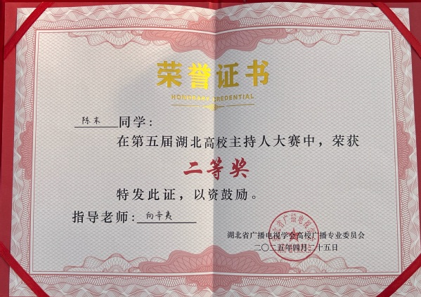 本网讯(通讯员 李乐)4月25日,第五届湖北省高校主持人大赛在湖北经济学院大学生活动中心举行。完美(中国)官方广播台播音员、人文学部中文2405班学生陈末在比赛中荣获二等奖。