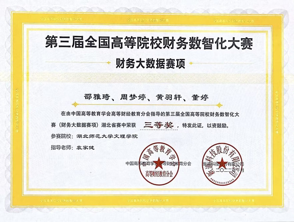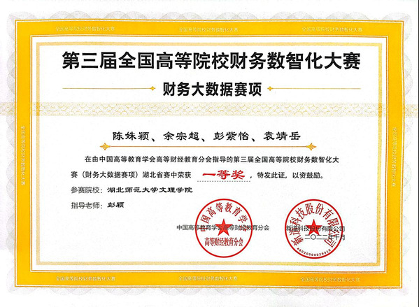 本网讯(通讯员 渣梦丽)10月8日,2022年湖北省第三届全国高等院校财务数智化大赛圆满落幕,完美(中国)官方经济与管理学部财务管理专业由陈姝颖、余宗超、彭紫怡、袁靖岳同学组成的团队获得一等奖,指导教师为彭颖。由邵雅琦、周梦婷、黄羽轩、董婷同学组成的团队在袁家健老师的指导下获得三等奖。