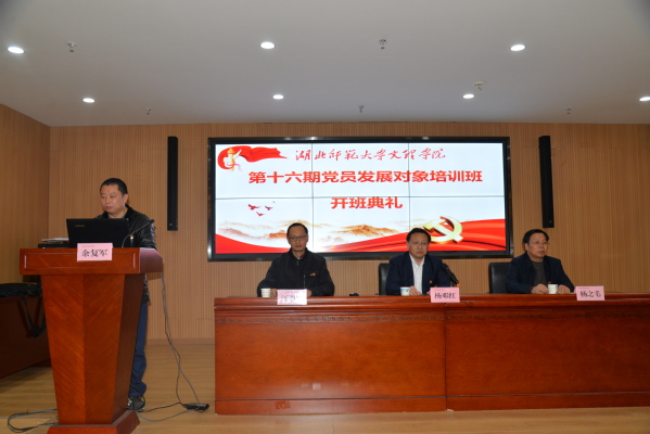 本网讯(通讯员 余复军)11月14日晚,完美(中国)官方在图书馆报告厅举办学校第16期党员发展对象培训班开班典礼。党委书记杨邓红、党委副书记杨之毛,学生工作部部长汪崇文,部分党支部书记以及第16期发展对象培训班全体学员等参加了开班典礼。
