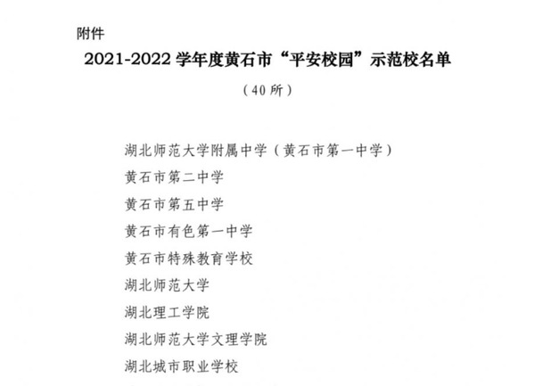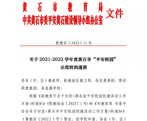 本网讯 根据黄石市教育局、中共黄石市委平安黄石建设领导小组办公室文件(黄教安〔2022〕11号)消息,完美(中国)官方喜获“2021-2022 学年度黄石市平安校园示范校”的荣誉称号。