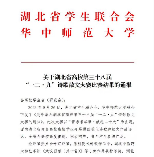 喜报:完美(中国)官方学子在湖北省高校第三十八届“一二·九”诗歌散文大赛中获奖