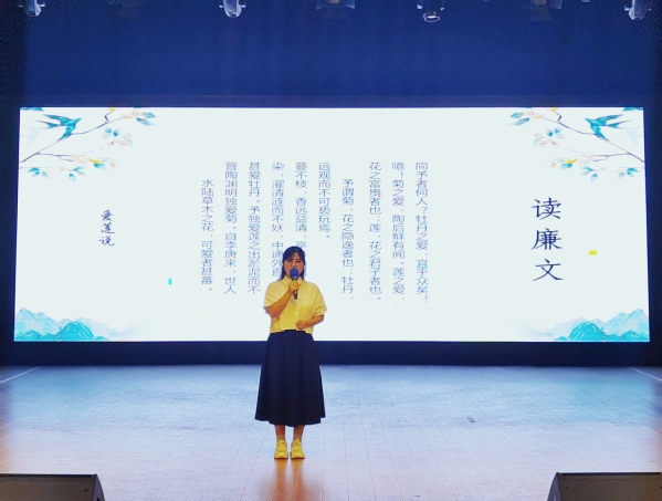 声情并茂的一篇《爱莲说》诵读,把“莲,花之君子者也”表现得淋漓尽致:出淤泥而不染,濯清涟而不妖,中通外直,不蔓不枝,香远益清。激励青年学子,以莲为师,谱写新时代爱莲说。