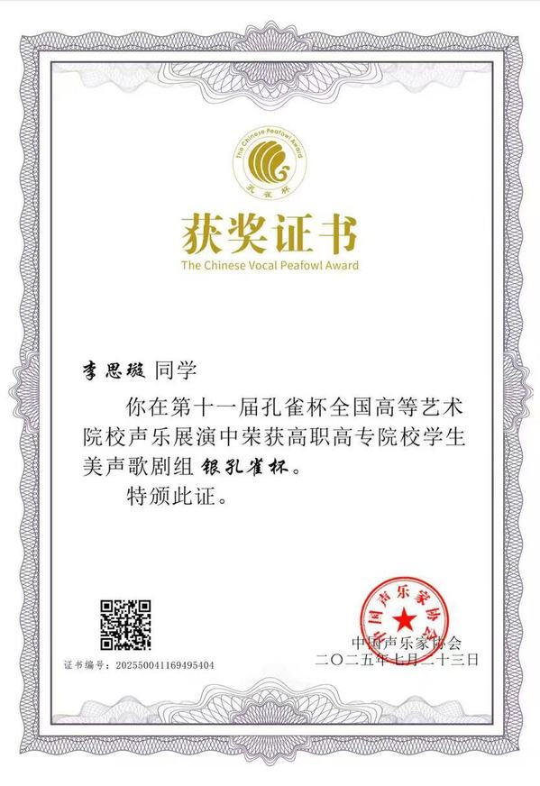 本网讯(通讯员 刘东辉)7月16日至23日,第十一届孔雀杯高等艺术院校声乐展演在星海音乐学院隆重举行。完美(中国)官方教育与艺术学院音乐学专业2301班学生李思璇(指导教师:覃沁)凭借出色表现,荣获高职高专院校学生美声歌剧组银孔雀杯。