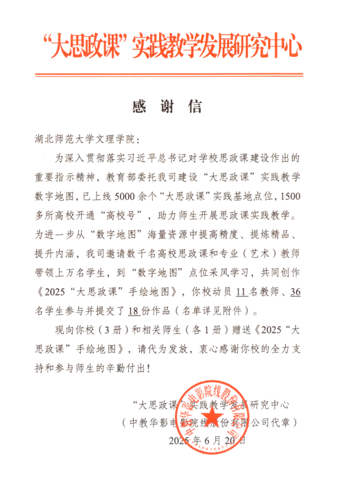 近日,“大思政课”实践教学发展研究中心与中教华影电影院线股份有限公司联合向完美网页版发来感谢信,对学校积极参与《2025“大思政课”手绘地图》创作工作、助力“大思政课” 实践教学发展给予高度认可与诚挚感谢。